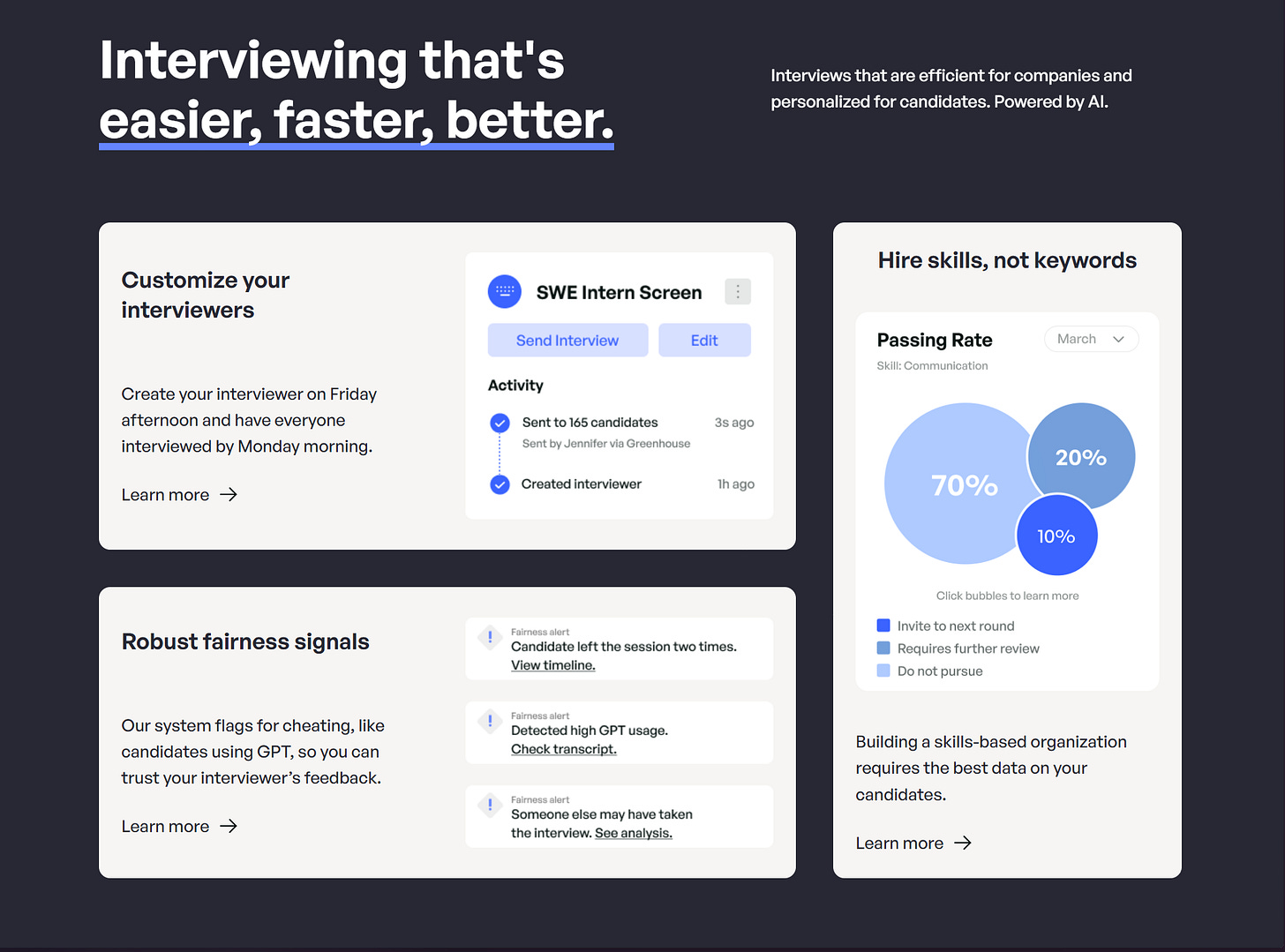 Alex, Apriora’s AI interviewer, conducts live interviews via video and phone, offering better-hiring insights than traditional recruiters and providing a personalized, conversational experience that candidates prefer. Alex conducts thousands of interviews for clients across various sectors, such as software engineering, retail, hospitality, and customer service, helping companies make smarter hiring decisions.