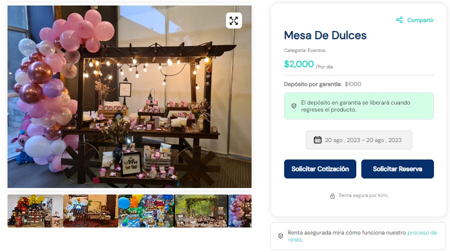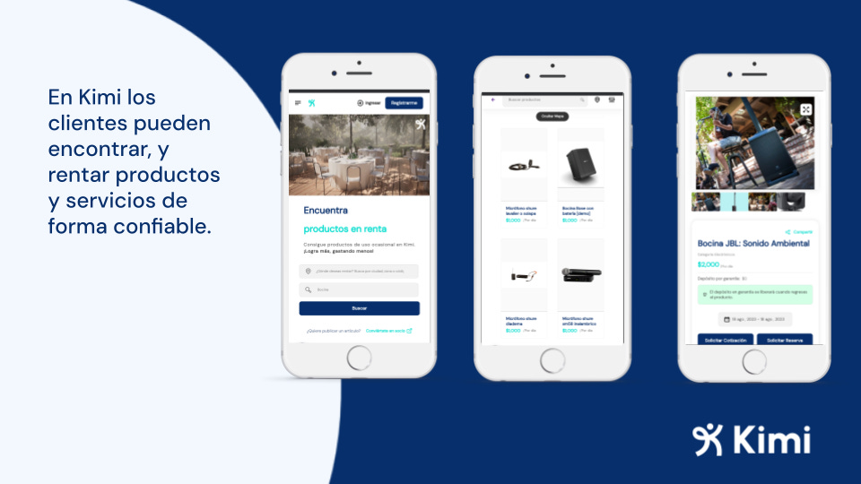 Kimi is like eBay or Mercado Libre for rentals. On Kimi, you can find and rent equipment and services ranging from clothing to events, sports, machinery, medical items, catering, bartenders, and DJs.